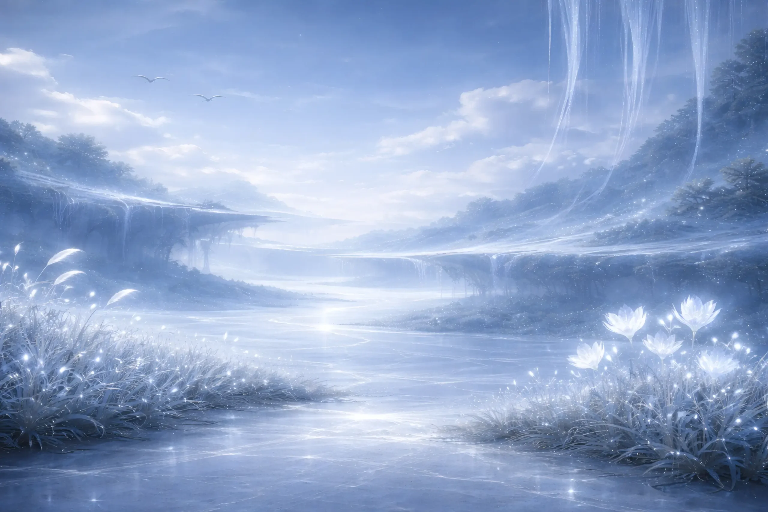 It threads through open sky in patient currents, brushing against skin with a cool, silken touch. Mist gathers and thins in slow folds, drifting past like thought half-formed and then released. Light shifts constantly — not bright, not dim — but breathing, as though the sky inhales and exhales around you.