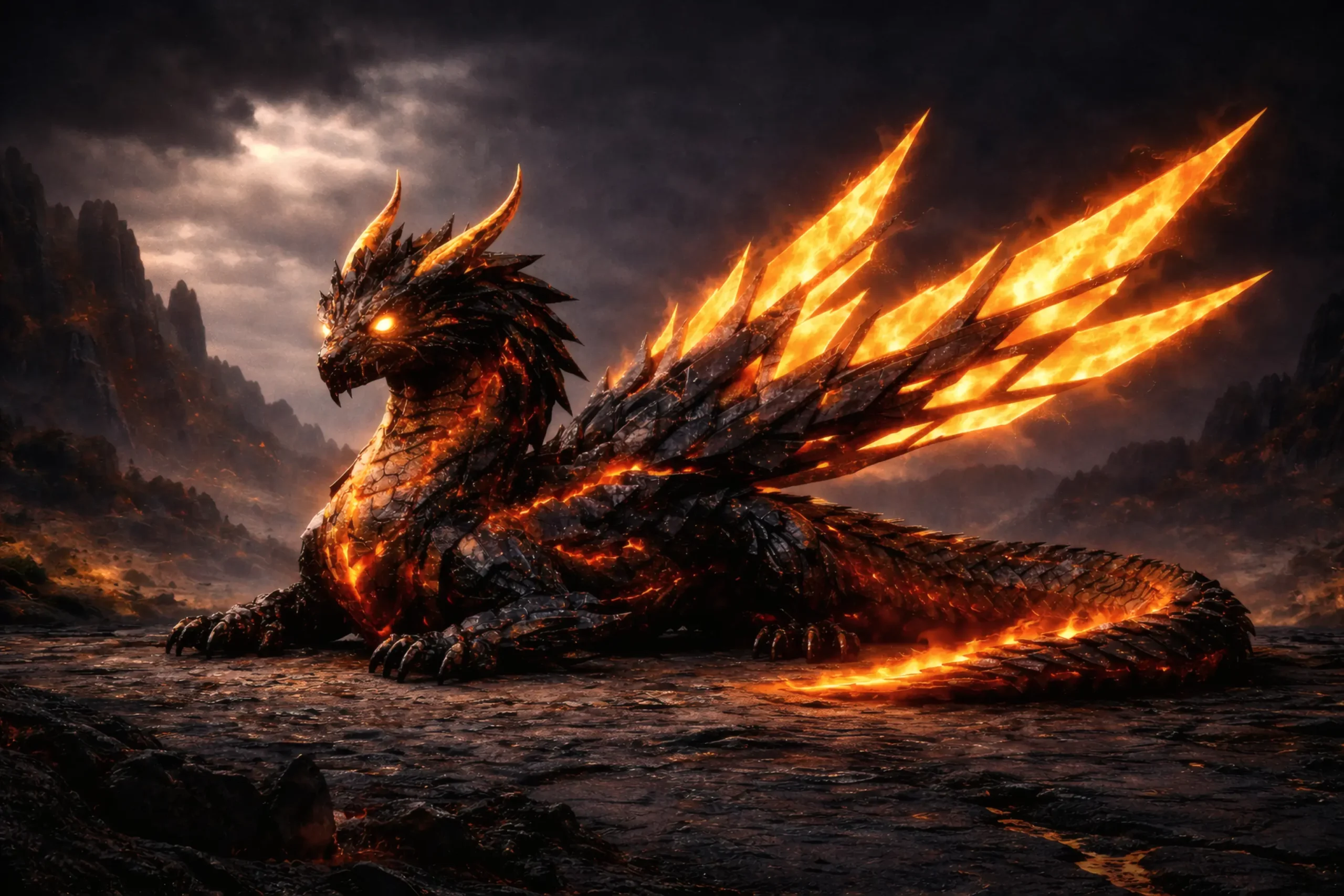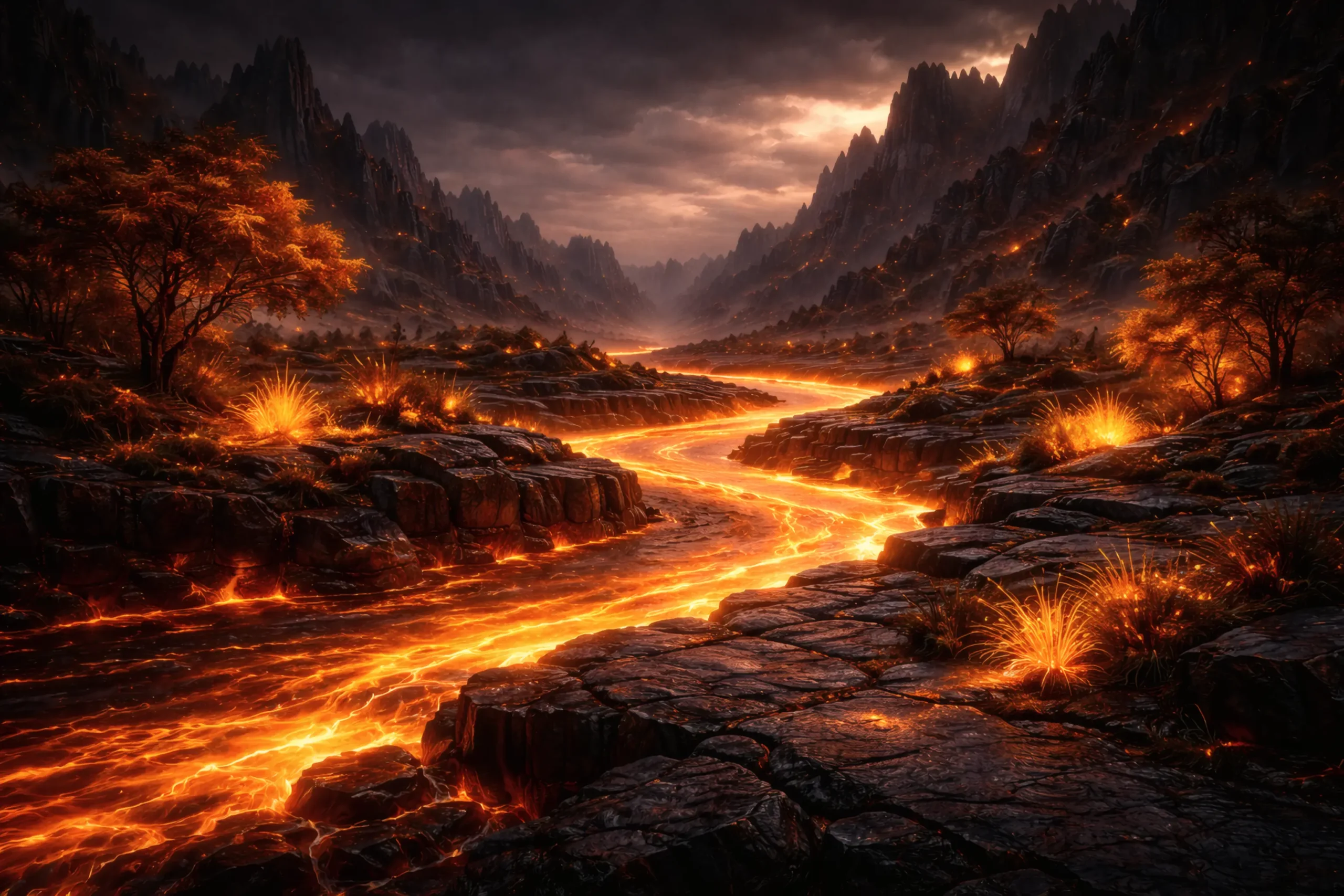 The ground is dark obsidian, layered and scarred, yet warm beneath the feet. Fine fractures glow with slow gold currents, not blazing but steady, as though light has chosen to live inside the stone rather than escape it. When wind crosses the plains, it carries sparks instead of dust — brief flares that arc and fade before touching earth.
